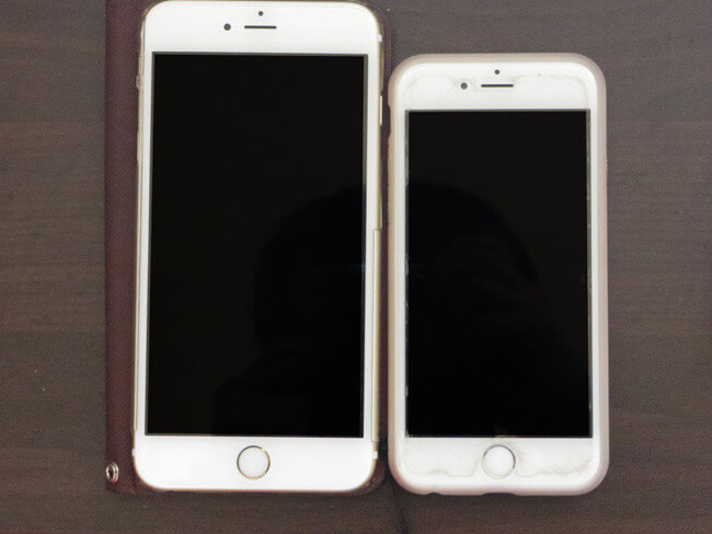 iPhone6s plusと、iPhone6sを並べるとこんな感じ。結構違いますよね。